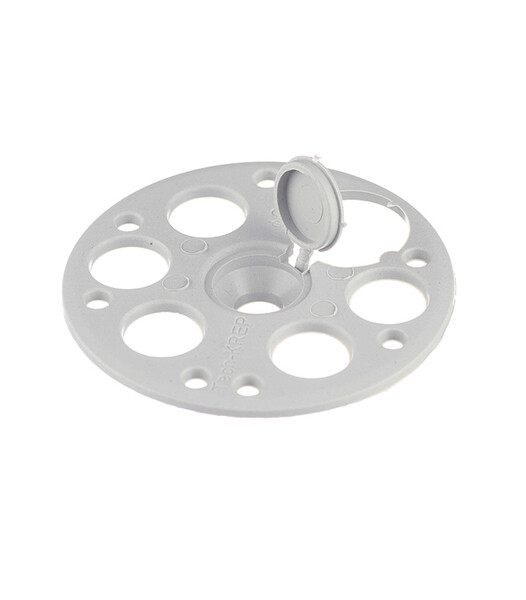 Благодаря большой шляпке изделие часто именуют тарельчатым фиксатором или рондолем. Оно представляет собой круглую шайбу для прижима с отверстием под саморез и защитной крышкой, которая минимизирует тепловые потери, предотвращая "мостик холода", а также оберегает крепеж от ржавчины, повышая общую эффективность изоляции.
